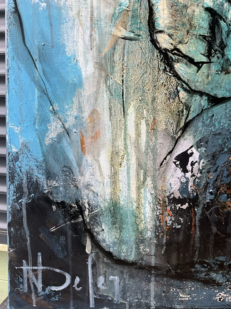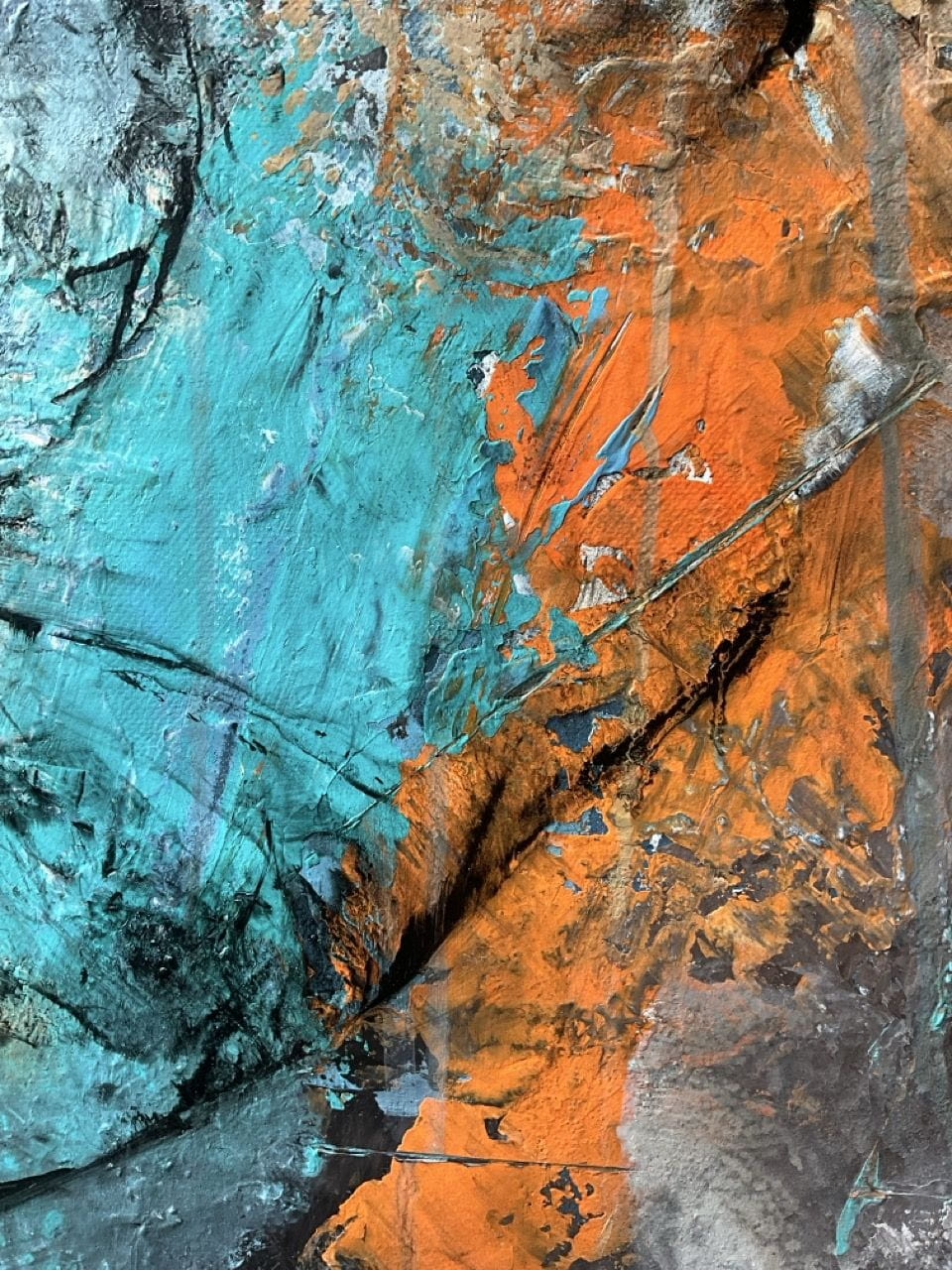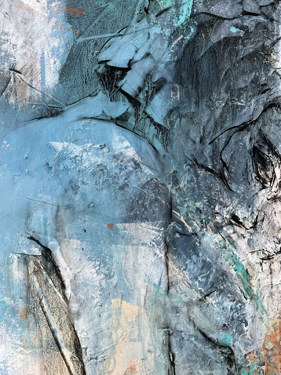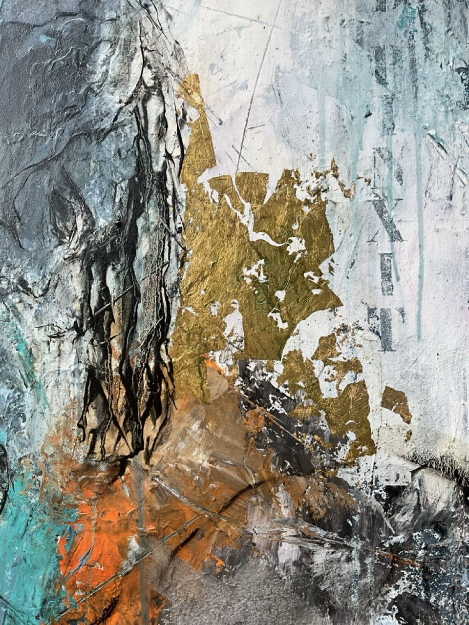 ACRYLIQUE, HUILE, COLLAGE FEUILLE D’OR, SABLE